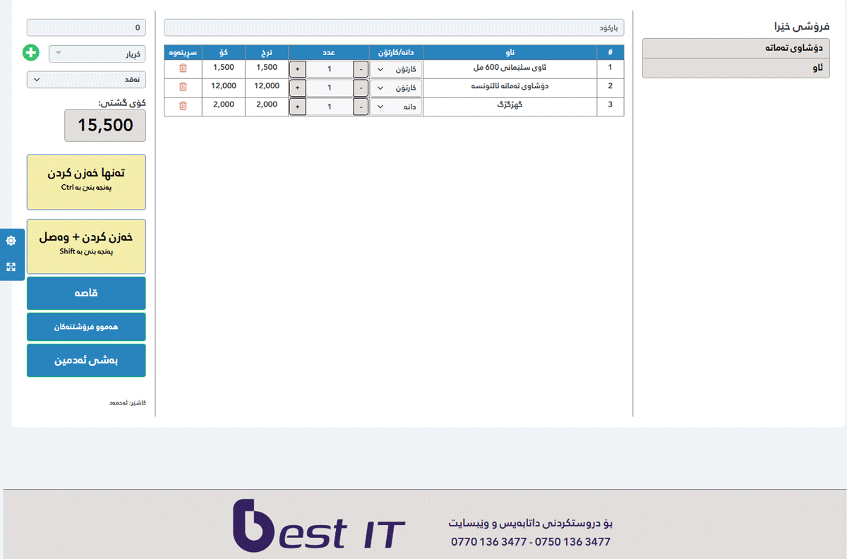 بۆ یەکەمین جار لە کوردستان و عێراق باشترین سیستەمی کاشێری بۆ مارکێت و دوکانەکان بە شێوازێکی مۆدێرن و جیاواز تەنها بە 17 هەزار دینار، کە هەموو وردەکارییەکان لەخۆ دەگرێت. 🥇 جیاوازی ئەم سیستەمە چییە؟ 🤷🏻♂️ ✅ ئاسانی لە بەکار هێنان تەنها بە دروستکردنی ئەکاونتێک هەموو خزمەتگوزارێکان بەردەست دەبێت ✅ زانیارییەکانت پارێزراون ئەگەر کۆمپیوتەرەکەشت بسوتی و لە کاربکەوێت ✅ دەتوانیت لە ڕێگای مۆبایلەکەتەوە چاودێری مارکێتەکەت بکەیت لە هەر شوێنێک بیت، قازانج و وردوکارێکان ببینی ✅ تۆمارکردنی هەموو کەرەستەکان بۆ ئێوەی ئازیز ✅ پاڵپشتی بەردوام بۆ هەتا هەتایە ✅ مانگی یەکەم بێبەرامبەرە، دەتوانیت تاقی بکەیتەوە پێش بەشداریکردن ✅ فێرکاری تەواو بۆ سیستەمەکە ✅ هەرزانی نرخ ✅ کوالیتی بەرز و خیرایی لە کاتی بەکارهێناندا تایبەتمەندییەکانی سیستەمەکە: ⭐ کڕین و فرۆشتن بە ئاسانترین شێوە ⭐ زانین و پارەدانی قەرزی کڕیار و فرۆشیار بە ئاسانترین شێوە ⭐ ئاگادارکردنەوە لەکاتی بەسەرچوون یان نزیک بووەنەوە لەکاتی بەسەرچونی کاڵاکان ⭐ ئاگادارکردنەوە لەکاتی کەم بوونەوەی کاڵایەک یان تەواوبوونیدا. ⭐ پێدانی ڕاپۆرتی مانگانە یان هەر بەروارێک لەسەرخواست بۆ زانینی قازانج ⭐ پێدانی ڕاپۆرت بۆ زانینی پڕفرۆشترین کاڵاکان ⭐ خەرجی رۆژانە ⭐ مووچەی کارمەند ⭐ بەشی تەلەف بۆ ئەو کاڵایانەی کە بەسەرچونو یان تێکچوو یان شکاون ⭐ بەشی داشکاندن (بۆ نموونە ئەڵێی ئەم کاڵایە بۆ ئەم مانگە داشکاندنی بۆ کراوە کە مانگەکە تەواو بو خۆی داشکاندنەکە لادەبات) ⭐ تەنها بە کلیکیک دەتوانی پرنتی بارکۆدی کاڵا بۆ سەر کاڵاکە بکەی ئەگەر بارکۆدی نەبوو ⭐ تەنها بە کلیکێک دەتوانی پرنتی ناو و نرخ بۆ سەر رەفە بکەیت ⭐ تەنها بە کلیکیک دەتوانیت پرنتی ناوو نرخی کاڵاکە بکەیت بە گەورەیی و ئەگەر داشکاندنیشی بۆ کرابوو نرخی پێش داشکاندن و دوای داشکاندنیش دەنووسێت ⭐ کەشف حساب ⭐ نرخی خەمڵێنراوی کاڵاکەت لەناو مارکێتەکەتدا چەنەدە ⭐کۆی گشتی خەرجییە جێگیرەکان چەنەدە ⭐ چەندین تایبەتمەندی وردی کەی تێدایە ⭐ ئەگەر شتێکیشت ویست لە سیستەمەکە نەبوو ئەوە بەپێی خواستی خۆت بۆت زیا دەکەین 💰ئەم هەموو خزمەت گوزارییە تەنها مانگانەی 17 هەزار دینار ⌛بۆیە پەلە بکەو پەیوەندیمام پێوە بکە ئەم ئۆفەرە کاتییە 📍ناونیشان سلێمانی دوو سایدی چوارتای کۆن خوار فۆردی کۆن 07701363477 واتساپ 07501363477 زۆر لە کۆمپانیا بەناوبا نگەکان متمانەی پیکردوین و بە خۆشحاڵییەوە سیستەم و داتابەیس و وێبسایتمان بۆ دروست کردون، تۆش دەتوانێت سیستەمی کۆمپانیاو بزنسەکەت بە ئێمە بسپێریت. بێست ئای تی بۆ دروستکردن سیستەم و داتابەیس و وێبسایت #بێست_ئایتی #مارکێت #سیستەمی_مارکێت #کاشێر #سیستەم #داتابەیس #سیستەمی_کاشێر #وێبسایت #ئایتی #بێست_ئای_تی #Best_it